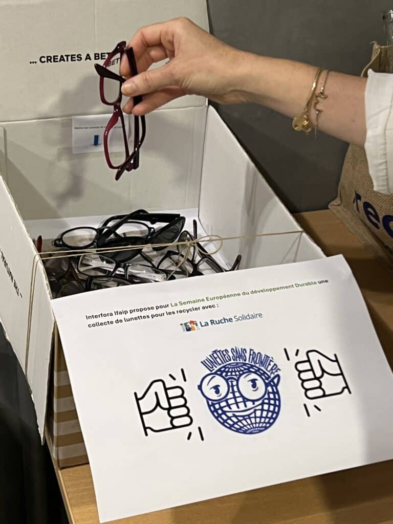 - Une collecte solidaire : une collecte de lunettes a été réalisée. Elles seront envoyées à l’association La Ruche Solidaire qui va les recycler.